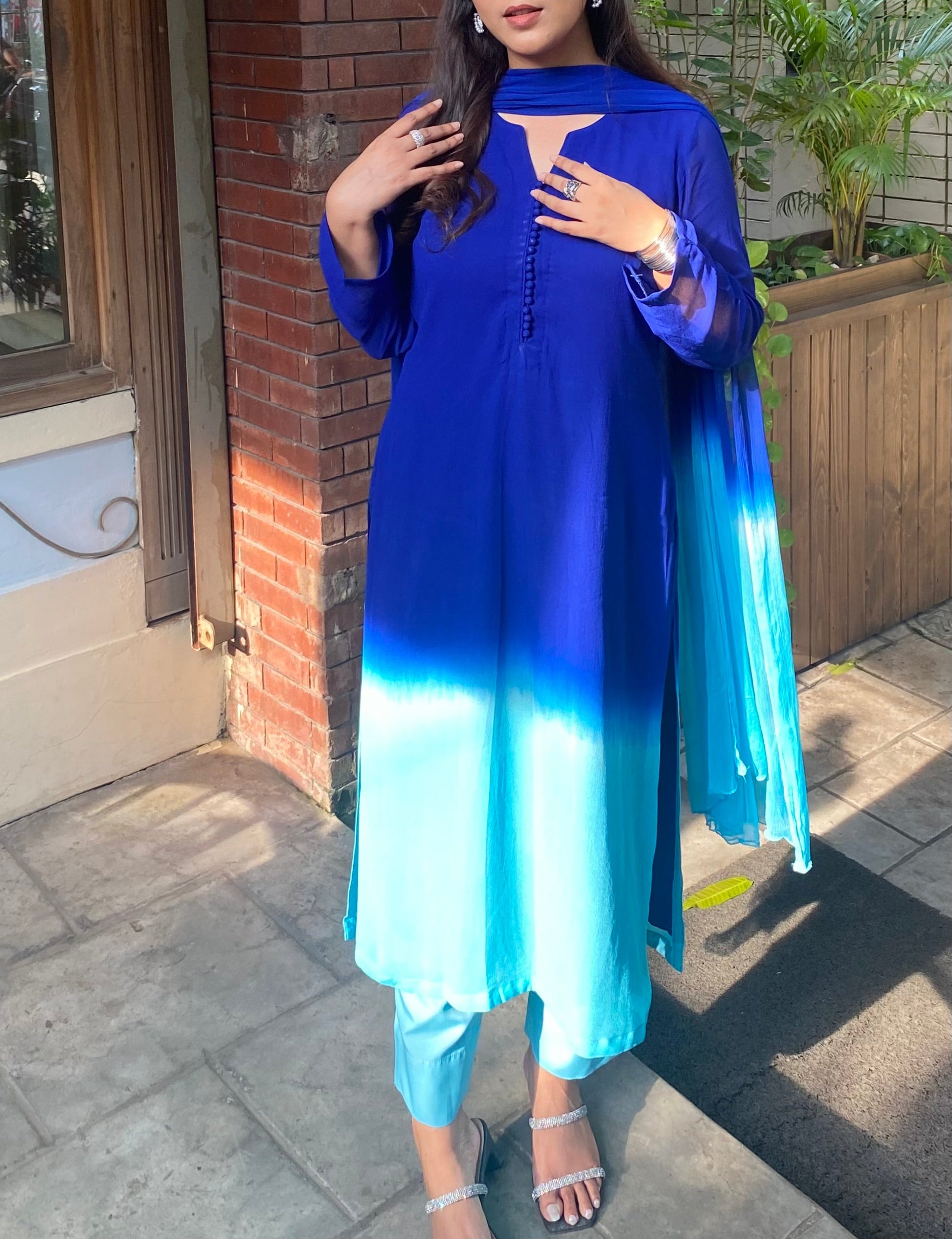 Vibrant cobalt blue fades into turquoise, creating a striking ombré effect. The lightweight kameez with matching turquoise pants, paired with an airy orna that moves effortlessly, offers a graceful drape.