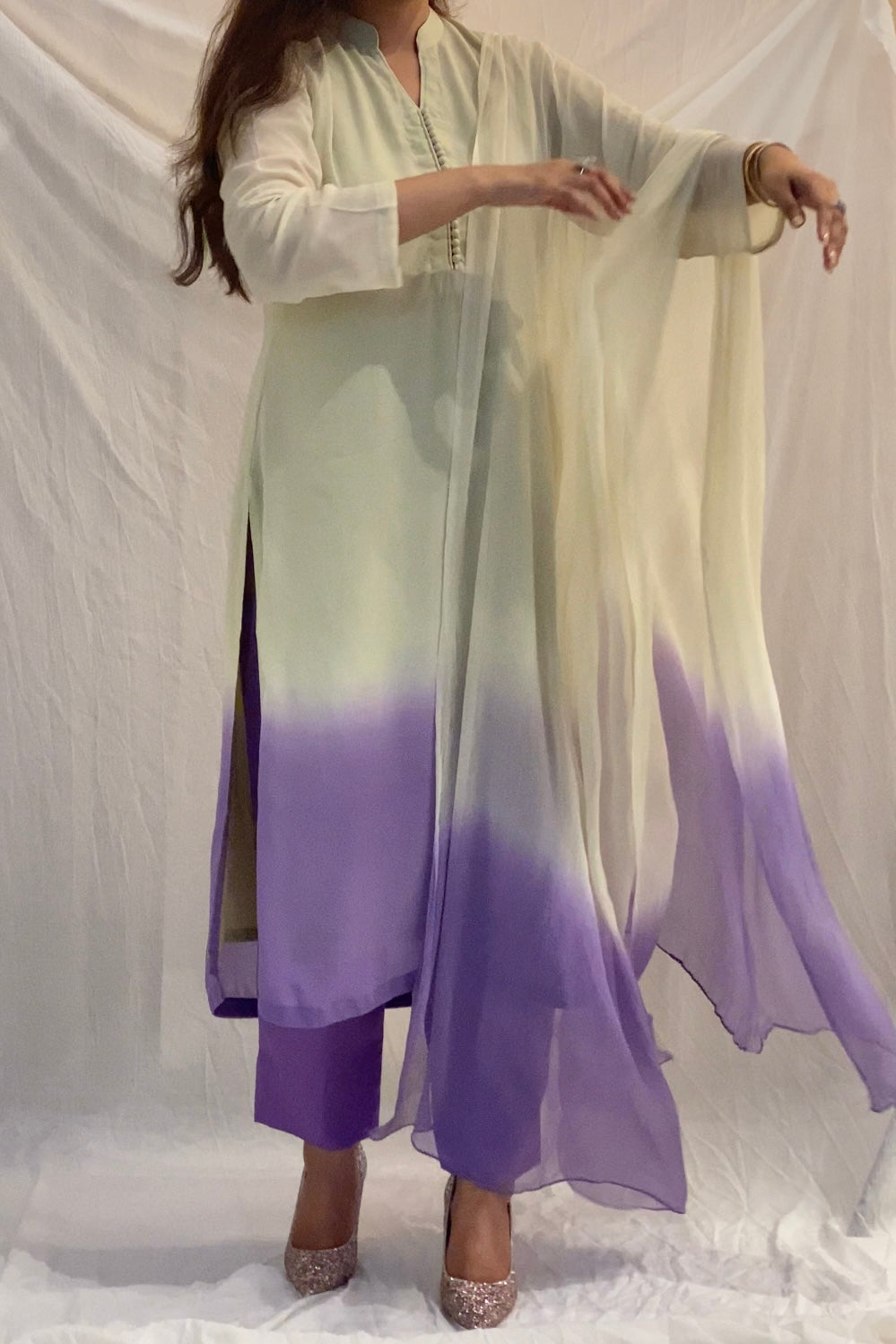 Materials: Viscose kameez with silk inner lining (excluding sleeves), Silk pants, and Pure chiffon orna